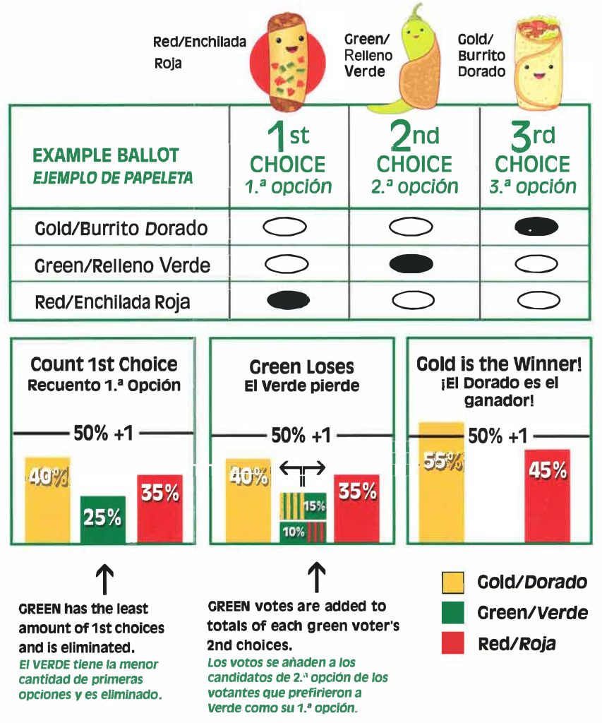 If no candidate gets a majority of first preference votes, the candidate with the fewest first preference votes is eliminated. Voters who picked this candidate as their #1 now have their 2nd preference vote count. If a candidate gets a majority, they win! Si ningun candidato obtiene la mayoria de las votos de primera preferencia, el candidato con menos votos de primera preferencia es eliminado. Si el candidato que usted eligió como su favorito fue eliminado, su voto será asignado al candidato de su segunda preferencia. El conteo continuará hasta que un candidato obtenga la mayoría.